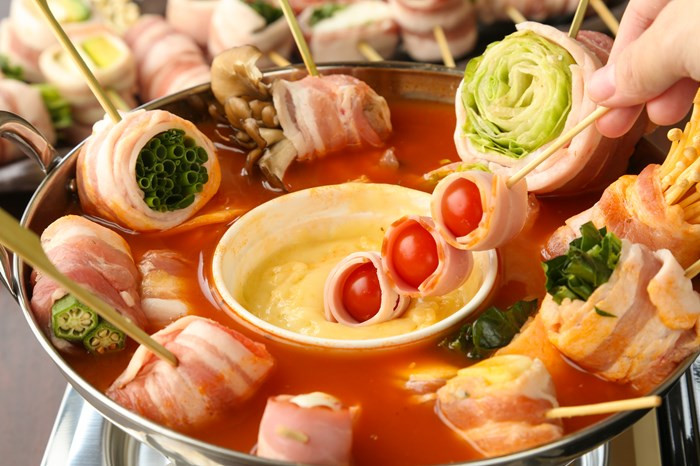 ハッシュタグが提供しているトマトチーズ鍋は、おしゃれな見た目とヘルシーでありながらコクの深いお味に、これまでにも多くの喜びの声を頂戴してきた実績のある、女性からの人気の高いメニューです。トマトとチーズの相性は抜群で、野菜巻き串と併せて召し上がっていただくことで幅広い味わいを楽しめますので、大人数での女子会や飲み会等の各種宴会にもぴったりです。トマトスープでじっくり温めた野菜巻き串を、とろとろのチーズに絡めて食べる、冬にぴったりの絶品料理です。